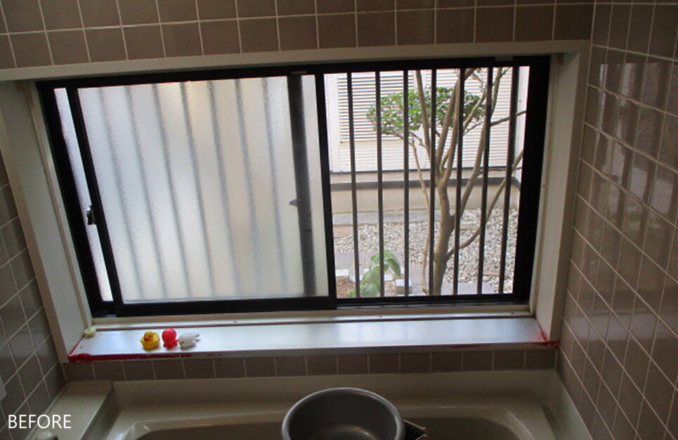 浴室の既存サッシが全開口サッシであったため、取替品は開口を狭くした。また、サッシ廻りの外壁塗装が天候不良により予定が遅れてしまいましたが、そのほかはスムーズに施工することができました。