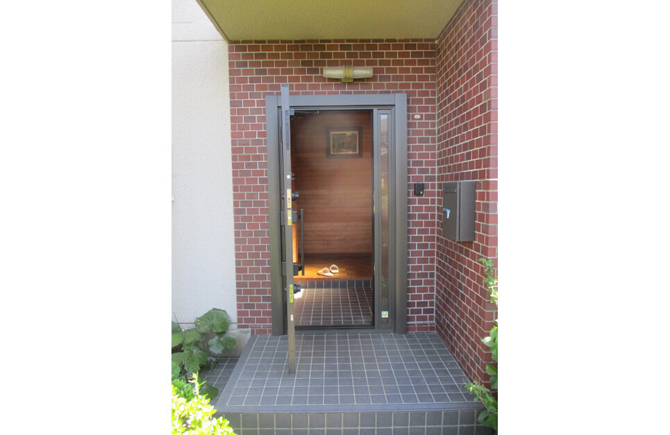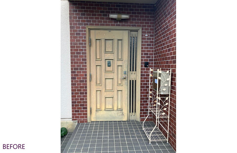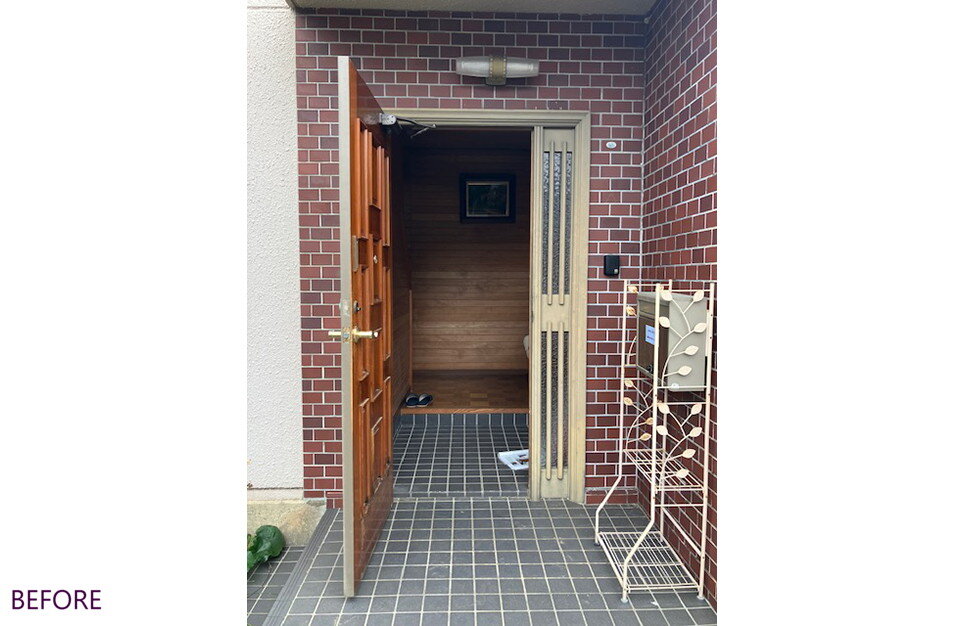 ドア交換の際、既存の床面を一部モルタルで補修する工程が必要でしたが、きれいに納めることができました。