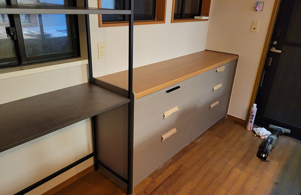 アシストポケットで大容量の収納力。出し入れも簡単です。フロアキャビネットとシステム収納を設置されたので、吊戸棚よりも楽に収納・取り出しが可能になり、お手入れも簡単です。また、ディスプレイしながら収納できる「カノール」も設置。お気に入りを見て楽しむ、しまい込まない収納で、モノの配置に心を配る暮らしは、整理する意識も自然と高めてくれます。シンクは「キレイシンク」で、継ぎ目や溝がなくなり、お手入れが簡単でキレイを保てます。水栓はタッチレス水栓で、センサーが感知して自動で水をコントロール。包丁やまな板も差し出すだけでサッと洗い流せます。